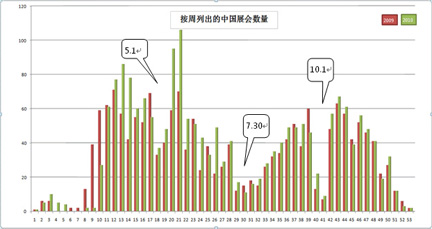 好展會(huì)從自身數(shù)據(jù)庫(kù)中檢索了2009年、2010年的展會(huì)情況,把開展日期按周分組,得到了本圖。