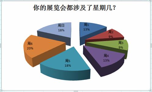 本報(bào)告還對(duì)每個(gè)展會(huì)涉及一周的哪幾天進(jìn)行了統(tǒng)計(jì)(統(tǒng)計(jì)工作量很大,但邏輯很簡(jiǎn)單,就是對(duì)每個(gè)展覽會(huì),每天算一遍,看屬于哪一天),下表是統(tǒng)計(jì)的數(shù)據(jù),您可以看到:20%的展會(huì)都會(huì)有周六的一天,而作為對(duì)比,涉及了周二、周三的比例只有9%。