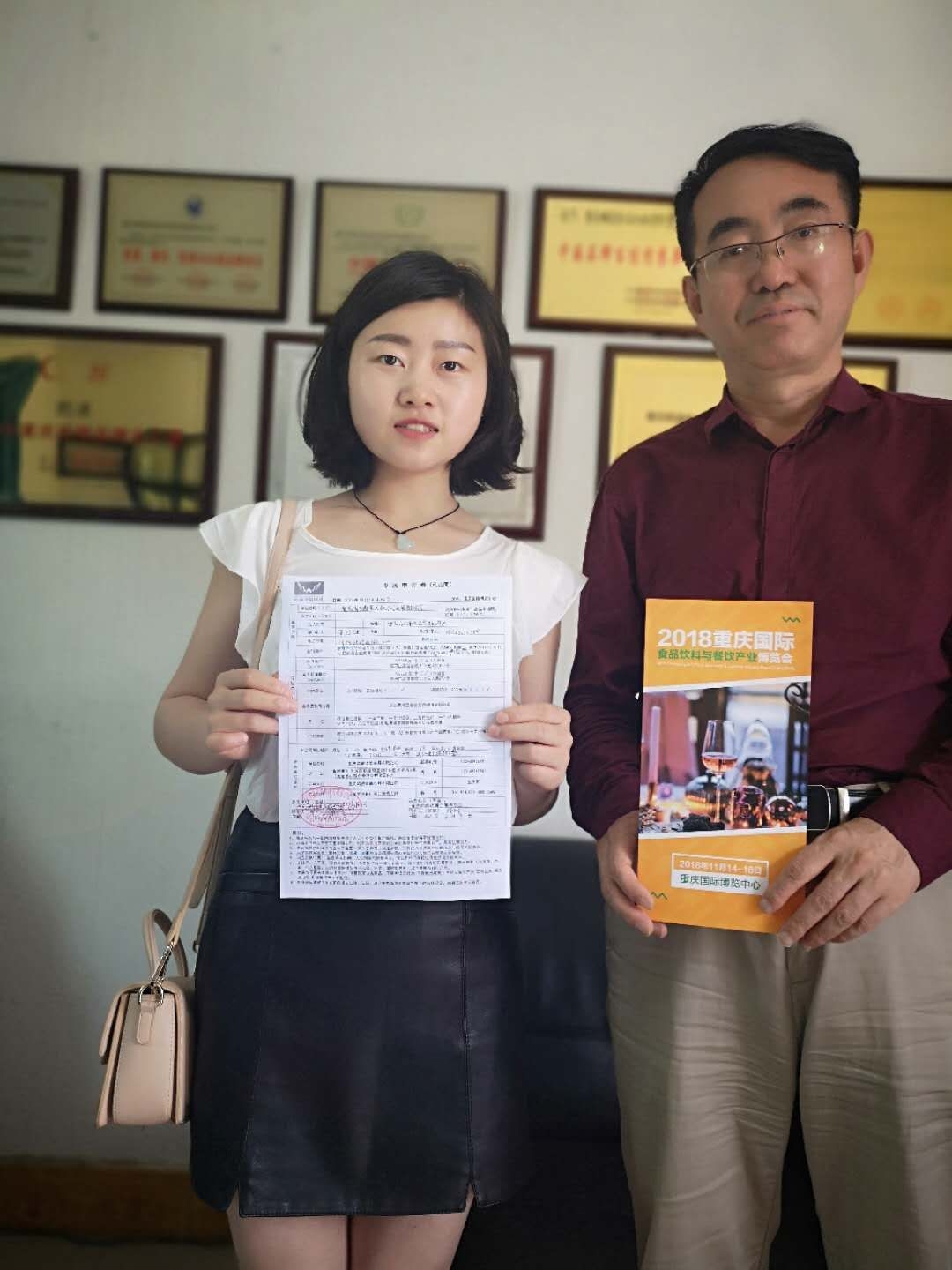 餐博會組委會工作人員楊珊(左)與重慶鵬通食品機械浦總(右)簽單合影