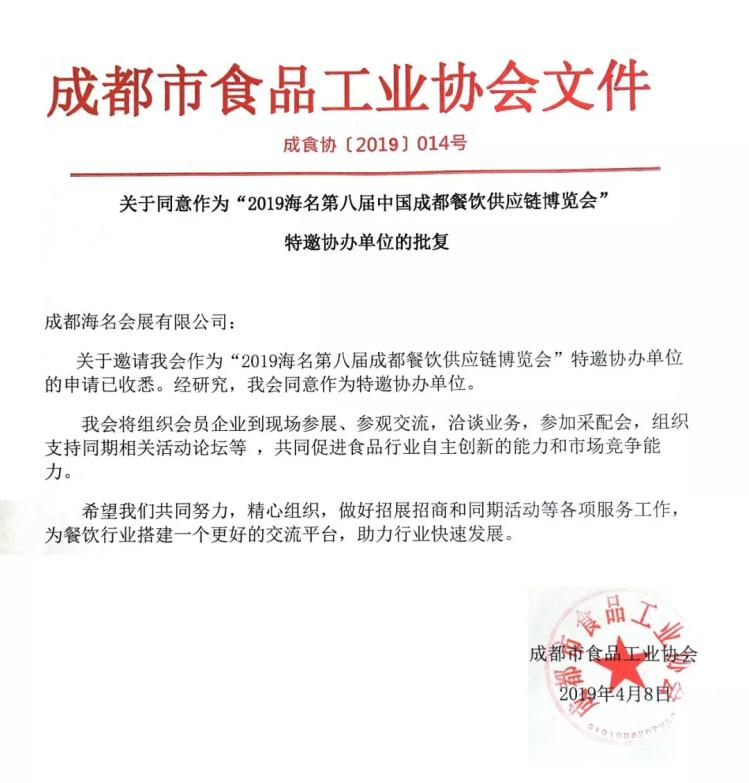2019年第八屆海名成都餐飲供應鏈博覽會獲眾單位支持,權威陣容,豪華頂配。由中國飯店協會、海名國際會展集團主辦;鄭州海名匯博會展策劃有限公司、成都海名會展有限公司承辦;成都市商務局、成都市博覽局以及四川省火鍋協會、重慶市火鍋協會、四川省酒店用品行業協會、成都美食之都產業商會等二十余家餐飲行業權威協會組織單位發文與主辦方海名會展達成戰略合作,集行業眾力,鏈接餐飲行業上下游資源,聚焦全國餐飲供應商、經銷商及終端采購商,打造全國性的餐飲供應鏈貿易平臺。