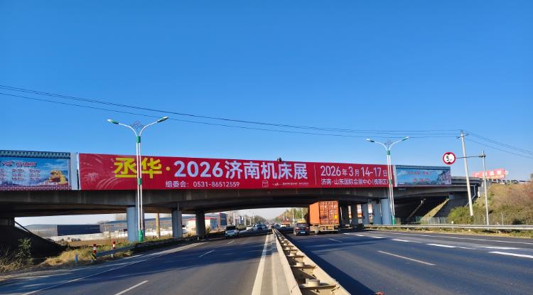 調研數據顯示,濰坊地區專業觀眾占濟南機床展全國觀眾總量的6%,且采購需求存在較大挖掘空間。基于此,展會在濰坊車流量日均3萬余輛的核心路段布局跨橋廣告,既借助高車流量實現展會大范圍曝光,又精準錨定濰坊產業帶流量樞紐,串聯周邊產業集群,讓展會信息隨車流傳至產業鏈上下游,為展會吸納更多精準采購商筑牢宣傳根基。