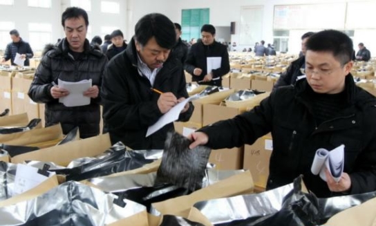 2月28日,中外客商在投標會上查看干紫菜樣品、填寫投標書。當日,江蘇省第三屆紫菜交易會在如東縣天一紫菜交易市場舉行,近31000箱干紫菜進場交易。由于受天氣環(huán)境等因素影響,今年紫菜產量較往年同期相比下降近50%,紫菜的單張價格上漲40%左右。這次交易會吸引了日本、美國、澳大利亞等10多個國家和山東、福建、廣東等沿海一帶地區(qū)近400位中外客商進場搶購紫菜。