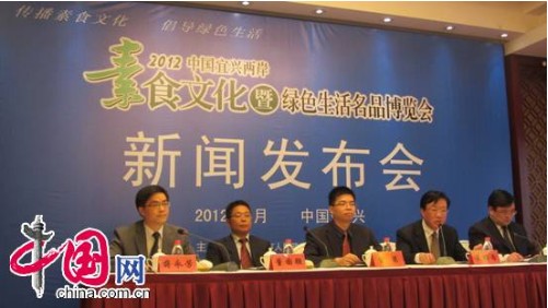 由宜興市人民政府、宜興市旅游局舉辦的2012中國宜興兩岸素食文化暨綠色生活名品博覽會新文發(fā)布會4月14日下午在宜興荊溪賓館會議廳舉行。
