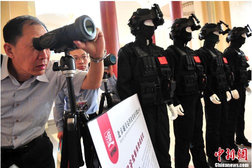 5月9日,“第八屆中國國際國防電子展覽會”在北京展覽館開幕,來自美國、瑞士、德國等12個國家和地區的三百多家海外知名品牌企業參展,數十家世界駐華使館的武官前來觀展。圖為軍警專用的國產數字化單兵作戰系統及夜間攝像儀吸引觀眾。(來源:中新網)