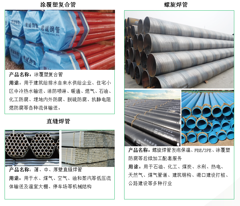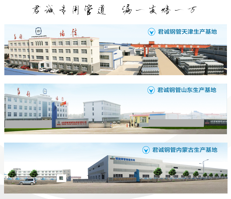 君誠(chéng)管道集團(tuán)是中國(guó)制造業(yè)企業(yè)500強(qiáng)、中國(guó)民營(yíng)企業(yè)制造業(yè)500強(qiáng)和中國(guó)產(chǎn)地名牌產(chǎn)品企業(yè)。集團(tuán)公司總部在北京,產(chǎn)銷基地坐落在——天津蔡公莊工業(yè)園區(qū)、山東焦橋南部工業(yè)園區(qū)和內(nèi)蒙古包頭九原工業(yè)園區(qū)。各子公司總占地近800畝,資產(chǎn)總計(jì)二十余億元,擁有熱鍍鋅鋼管生產(chǎn)線16條、直縫焊接鋼管生產(chǎn)線20條、襯塑復(fù)合管生產(chǎn)線11條、涂覆塑復(fù)合管生產(chǎn)線6條、螺旋縫雙面埋弧焊鋼管生產(chǎn)線6條、方矩鋼管生產(chǎn)線5條,以及預(yù)涂覆熱浸鋅鋼管、管接件等其他生產(chǎn)制造設(shè)施。君誠(chéng)管道在全國(guó)產(chǎn)品行業(yè)規(guī)模綜合處于前列,制定中國(guó)鋼管國(guó)家標(biāo)準(zhǔn)——《低壓流體輸送用焊接鋼管》(GB/T3091)、國(guó)家電網(wǎng)系統(tǒng)《輸電線路鋼管塔用直縫焊管》、《直縫電焊鋼管》(GB/T13793)、《國(guó)家電網(wǎng)特高壓輸電線路用管》、《給水涂塑復(fù)合鋼管》(CJ/T 120)、《國(guó)家排水用小螺距鋼塑復(fù)合用管》、《內(nèi)襯內(nèi)覆不銹鋼復(fù)合鋼管管道工程技術(shù)規(guī)程》、《鋼塑復(fù)合管》(GB/T28897)等標(biāo)準(zhǔn)。年設(shè)計(jì)生產(chǎn)能力Φ21-Φ219mm熱鍍鋅鋼管120萬(wàn)噸、Φ21-Φ273mm直縫焊管180萬(wàn)噸、Φ219-Φ3020mm螺旋鋼管30萬(wàn)噸、鋼塑復(fù)合管20萬(wàn)噸、方矩鋼管20萬(wàn)噸,以及預(yù)涂覆熱浸鋅鋼管、管接件等各類管道和其他相關(guān)產(chǎn)品年制造能力近400萬(wàn)噸。
