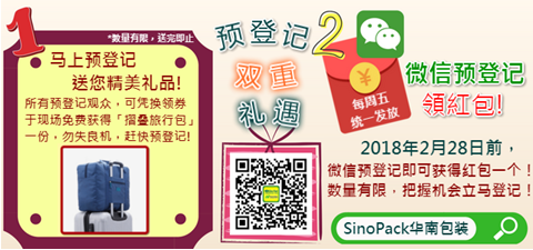 參展商名單現已上載至展會官方網站,觀眾可預先上網查看參展商名單并于網上進行預先登記。預先登記觀眾更可享有免費換領大會會刊和折迭旅行袋禮品、優先參加現場專題研討會及免除現場登記手續等優惠。立即到展會網頁www.ChinaSinoPack.com 或 www.PACKINNO.com進行預先登記,觀眾預登記截止日期為2018年3月4日。