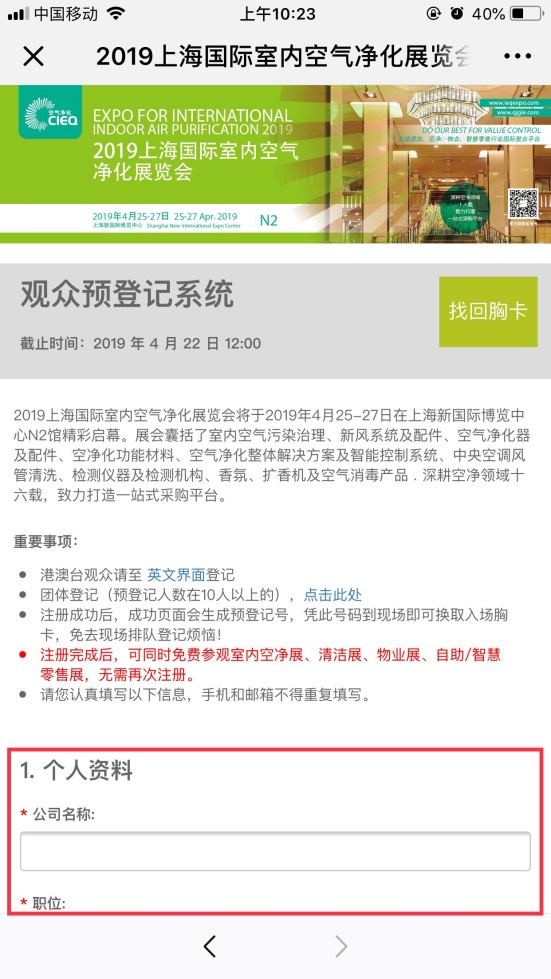 2019國際室內(nèi)空氣凈化展覽會觀眾預登記系統(tǒng)開啟后,移動端用戶可以通過展會官方微信:ccccexpo,點擊首頁“觀眾登記”完成觀眾注冊,電腦端用戶登陸CIEQ官方網(wǎng)站:www.ieqexpo.com 進行注冊,不僅可免費免排隊入場,同時,到場更有好禮相送!