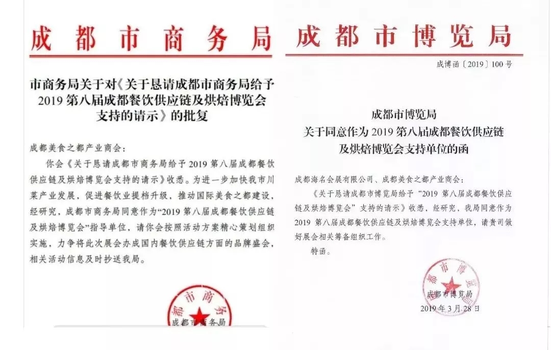 成都市餐飲業主管部門成都市商務局擔任2019年第八屆成都餐飲供應鏈博覽會指導單位,成都市博覽局擔任支持單位。展會在成都市商務局、成都市博覽局的指導與支持下,將高速提升成都餐飲展市場化、專業化、國際化和信息化運作水平。2019成都餐飲展將會整合行業商會、協會、政府機構、媒體等多方資源,進一步加強四川省以及全國餐飲行業資源整合、產業融合以及模式創新,帶動西南餐飲產業發展。