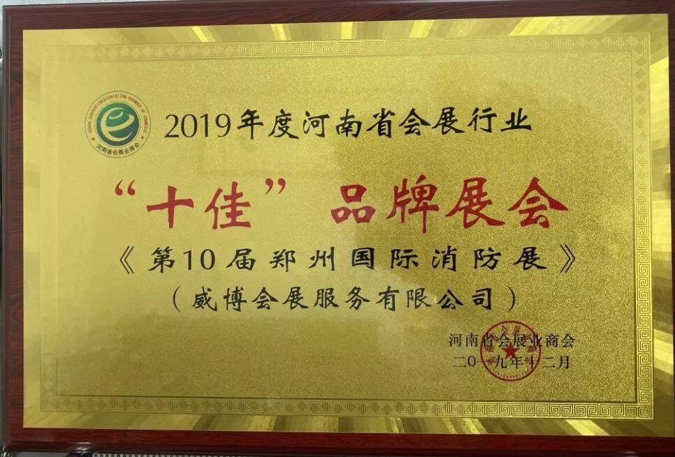 威博會展旗下舉辦的“CZFE第10屆鄭州國際消防展”被評為2019年度河南省會展行業(十佳)品牌展會!這是繼威博會展在摘得2019年中國會展品牌大獎(年度區域最具影響力會展品牌項目)桂冠后再次獲得省內行業主管部門及業內專家的高度認可!