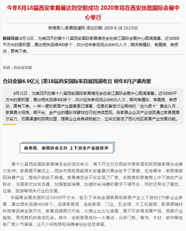 每年展會(huì)期間,相關(guān)媒體也會(huì)對(duì)展會(huì)盛況進(jìn)行全方位、高覆蓋式的宣傳報(bào)道。《中國(guó)家具報(bào)道》、《中國(guó)經(jīng)貿(mào)·家具中國(guó)》、《家居世界》、《華東家具》、《家居人物》、《家具酷》、香河家具城、家具迷、家具專區(qū)網(wǎng)、中國(guó)旅游報(bào)、中國(guó)信息報(bào)、陜西日?qǐng)?bào)、西安晚報(bào)、華商報(bào)以及陜西各電視臺(tái)等,都可見西安家具展的身影,其熱度可見一斑。