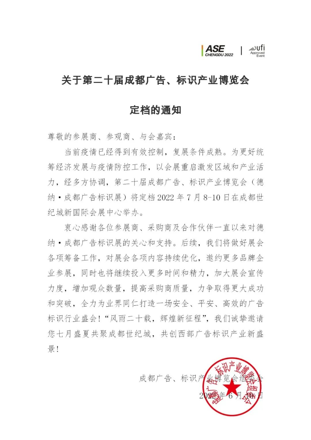 各位支持和關注德納·成都廣告標識展的朋友們,久等啦!當前疫情已經得到有效控制,復展條件成熟為更好統籌經濟發展與疫情防控工作,以會展重啟激發區域和產業活力,國內多個城市恢復舉辦展會。經多方協調,第20屆成都廣告、標識產業博覽會定檔啦!